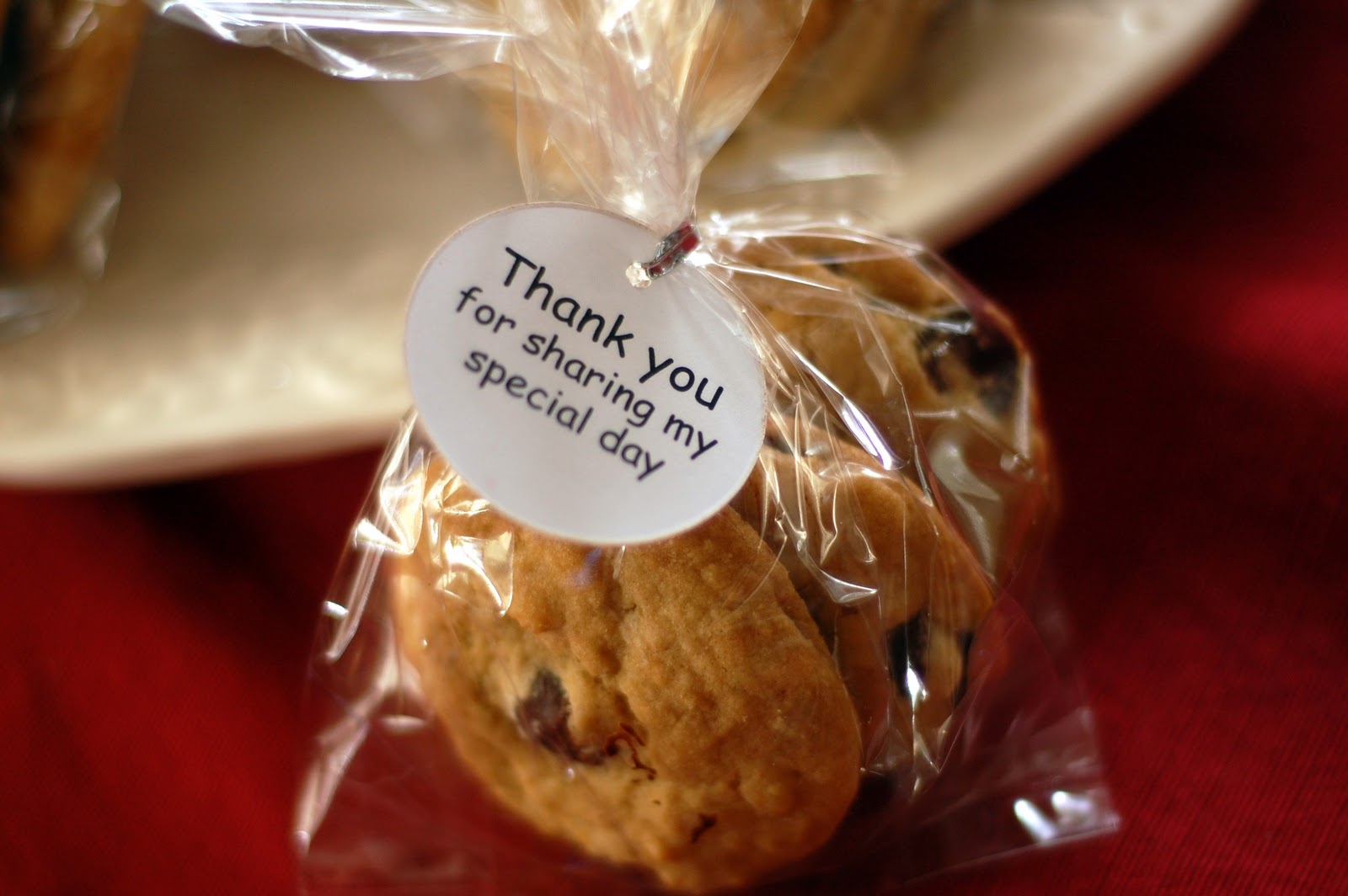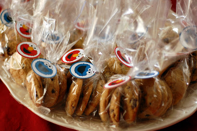 In keeping with the Cookie Monster theme I made 120 chocolate chip cookies to give away as favors to all of the guests (including the adults!). I really wanted to put some sort of note on the cookies so I started looking into favor tag designs. I wanted something very simple and basic and finally decided on a simple picture of Cookie Monster and Elmo with a nice Thank You on the back of the tags as a way of showing our thanks for those who came to the party. I used a 1/8″ punch to make the hole for the ribbon.
